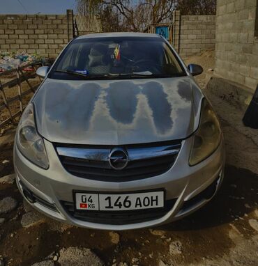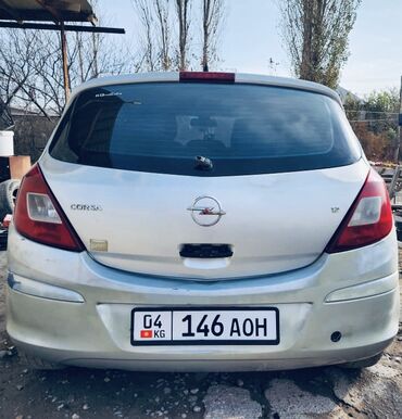 Opel Corsa D, 5‑дверный хэтчбек, серебристый цвет, левый руль. Двигатель 1.2 бензин, передний привод, механическая коробка (по эмблеме 1.2 и типу модели). Кузов с заводским аэродинамическим спойлером на крышке багажника. Легкосплавные диски, галогенные фары, противотуманные фары в переднем бампере. Задние сиденья складываются, пятая дверь с большим проёмом для погрузки. Наружные зеркала и ручки дверей в цвет кузова. На лобовом стекле установлен держатель и аксессуары в салоне; заднее стекло с обогревом и верхним стоп‑сигналом. Автомобиль на киргизских номерах (G4 KG 146 AOH). Подходит для города: компактные размеры, экономичный мотор 1.2, практичный 5‑местный салон и удобный багажник.