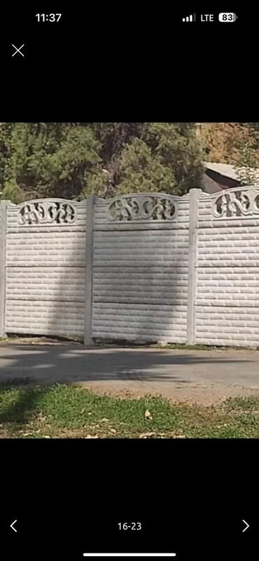 Железобетонные панели/секции забора в наличии 45 шт - Материал: армированный бетон. - Типы секций: глухие плиты и декоративные верхние секции с решётчатым орнаментом (ромбовидные прорези). - Назн...