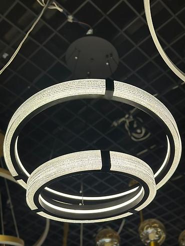 - Конструкция: два круглых светящихся контура разного диаметра, подвес на круглой потолочной платформе. Кольца соединены аккуратными перемычками, высота подвеса регулируется.