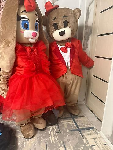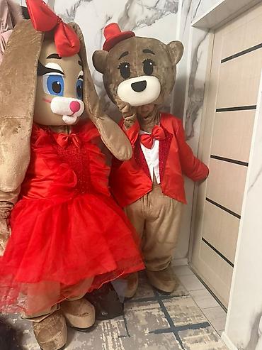 Анимационные персонажи для праздника: парные ростовые куклы медвежонок и зайка - Два полноразмерных костюма героев: белый медвежонок в мятном фраке, жилете и цилиндре; белая зайка в пышном мятном ...