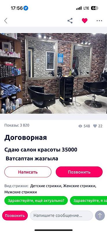 Примечание с объявления: «Сдаю салон красоты 35000. Ватсаптан жазгыла» Адрес пишпек базар.