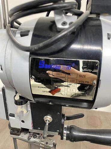 Комплект на фото: швейная головка Santa, промышленный стол и стойка для катушек, педали, блок управления, раскройный нож.