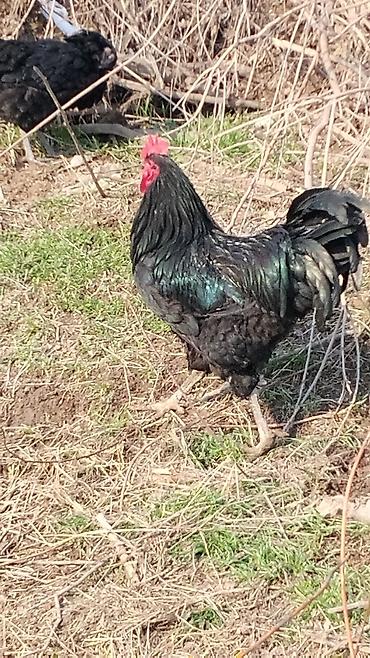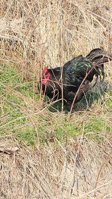 - Порода/тип: крупный черный петух с зеленым металлическим отливом оперения.