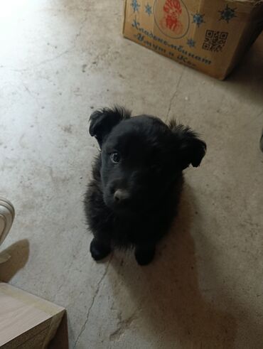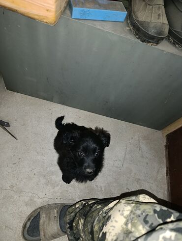 - Щенок черного окраса, коренастый, с мягкой шерстью и короткими лапами.