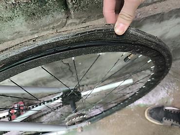 - Колеса: обода двойные, под тормозные дорожки; покрышки шоссейные узкого профиля. На фото видно: передняя покрышка разошлась по борту — требуется замена/ремонт.