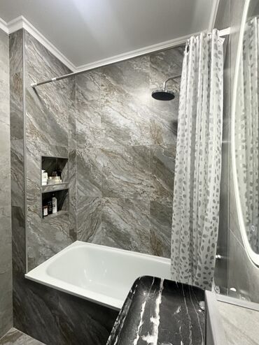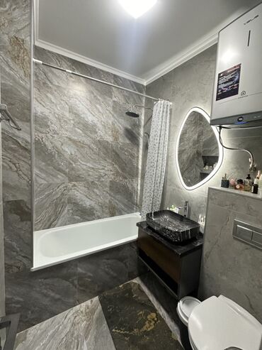 - Санузел совмещённый, в облицовке под мрамор: ванна, душевая зона с верхним душем, подвесной унитаз с инсталляцией, тумба с умывальником из камня, зеркало с подсветкой, накопительный водонагреватель.
