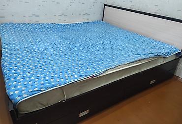 - Кровать двуспальная с высоким изголовьем. По бокам выдвижные глубокие ящики для хранения постельного белья и сезонных вещей. Основание под матрас сплошное.