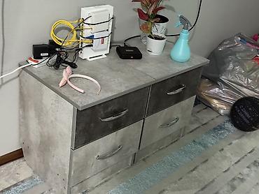 - Комод на ножках с четырьмя глубокими выдвижными ящиками, выдержанный в общей цветовой гамме комплекта.