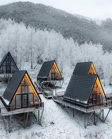 - Архитектура A‑frame: выразительный треугольный силуэт, панорамное остекление, высокий конек.