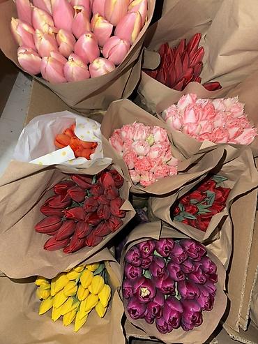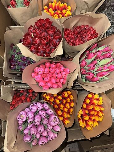 Тюльпаны — срезанные, свежие, в ассортименте сортов и оттенков.
