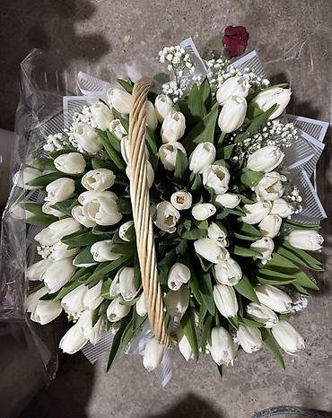 - Корзины из белых тюльпанов с добавлением гипсофилы