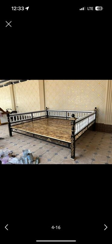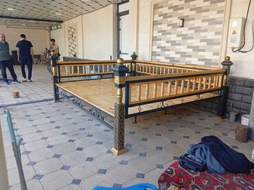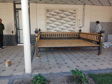 Садовые качели с металлическим каркасом и деревянным сиденьем. Каркас окрашен в темный цвет. Качели оснащены навесом, защищающим от солнца и дождя. Подходят для отдыха на свежем воздухе, на даче ил...