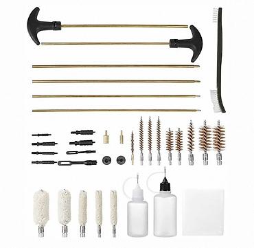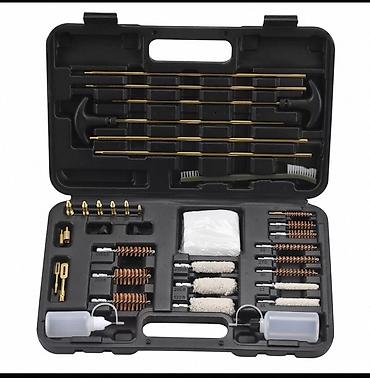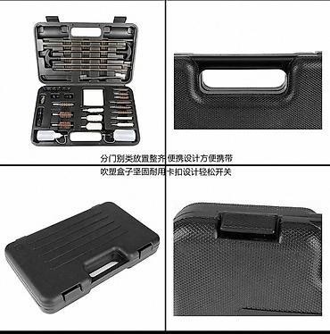Универсальный набор для чистки огнестрельного оружия в черном пластиковом кейсе. Комплект включает в себя различные щетки, шомполы, ершики и протирочные материалы, предназначенные для эффективного ухода за различными типами оружия. В наборе также присутствуют флаконы для чистящих средств. Все инструменты аккуратно размещены в отделениях кейса для удобства хранения и транспортировки. Подходит для регулярного обслуживания и поддержания оружия в чистоте.
