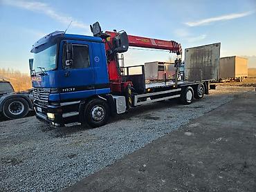 Техника: грузовой автомобиль Mercedes-Benz Actros 1831 с установкой кран-манипулятора Sany Palfinger SPS 25000. Площадка борта удлинённая, с аппарелями/откидной задней рампой для заезда техники. Гидравлические опоры, крюк, выдвижная стрела.