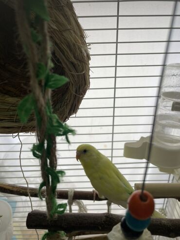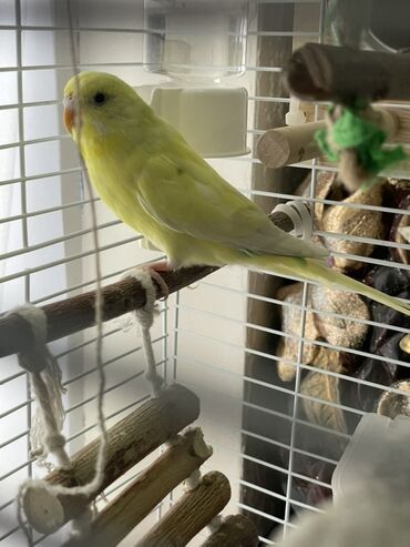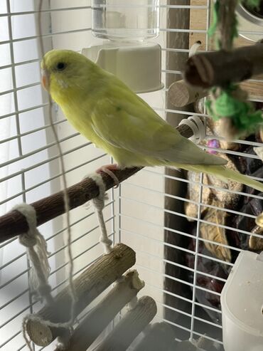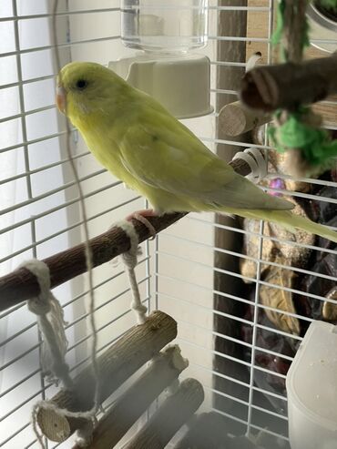 Волнистый попугай яркого лимонно‑жёлтого окраса в комплекте с клеткой и аксессуарами. Комплектация по фото: - Металлическая клетка с верхней ручкой-переноской, выдвижным поддоном и боковыми дверца...