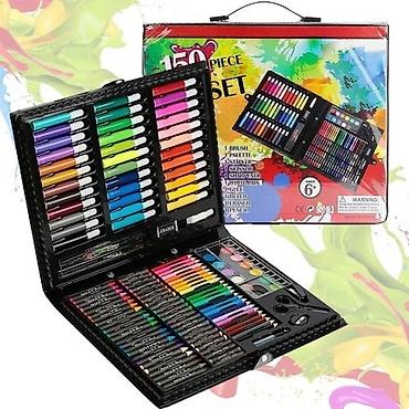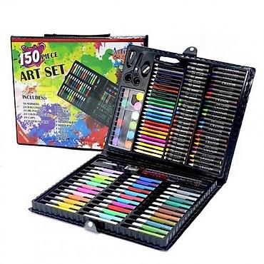 В нашем наборе есть все необходимое для занятие любимым дело, а именно 150 предметов: цветные карандаши, акварельные краски, восковые мелки, маркеры, канцелярские принадлежности и многое другое.