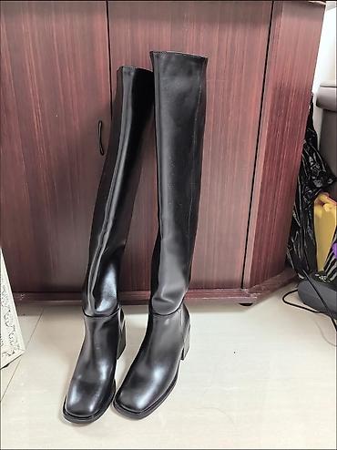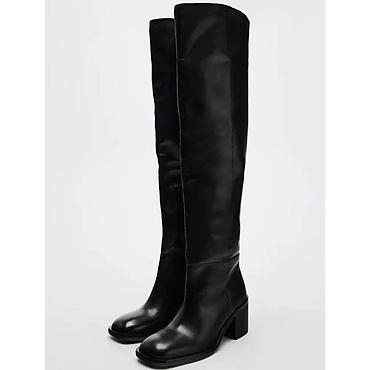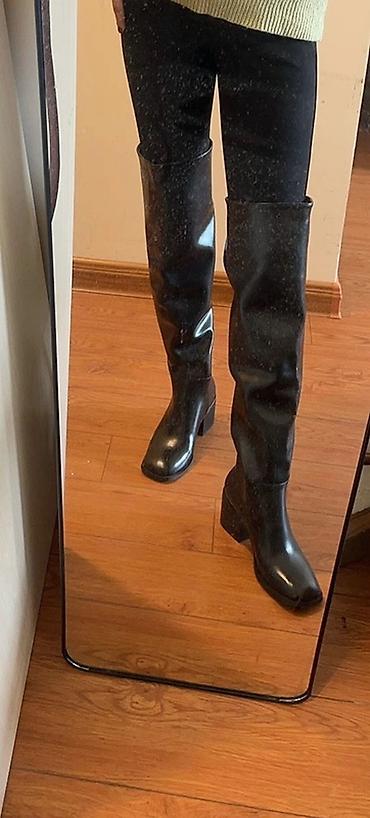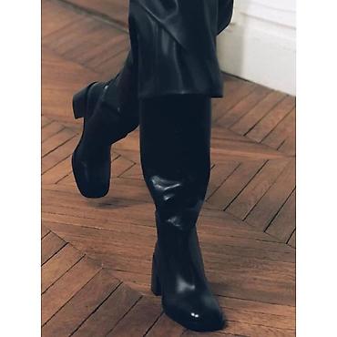 Высокие женские сапоги из чёрной гладкой эко-кожи с минималистичным дизайном.
