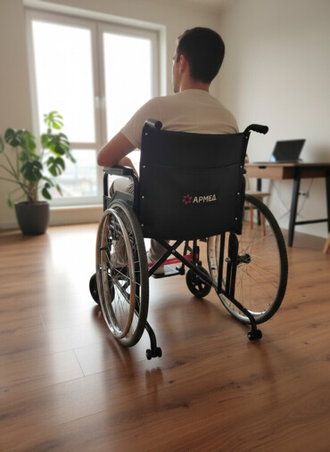 - Большие задние колёса с шинами и спицами — возможен самостоятельный ход; передние поворотные колеса для маневренности в помещении.