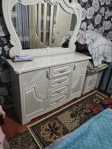- Туалетный стол/комод с большим фигурным зеркалом: центральный блок из 4 выдвижных ящиков, по бокам — закрытые ниши с полками.
