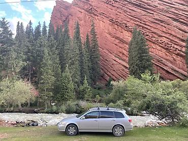 Номерные знаки KG (Кыргызстан). Автомобиль на фото со всех сторон: перед, зад, на природе и в городе. Подходит для активного отдыха и перевозки груза благодаря кузову-универсалу, рейлингам и фаркопу.