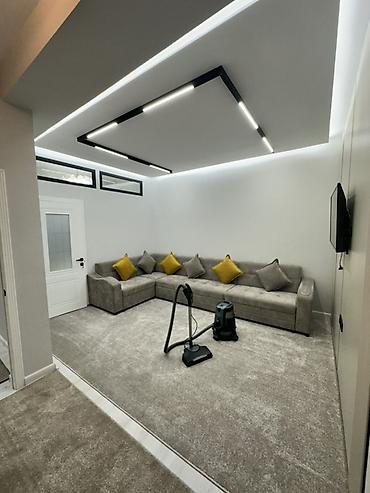 - Отдельная гостиная: большой П‑образный диван на всю стену с комплектом подушек, настенный телевизор, декоративно‑подсвеченный потолок с LED‑линиями и треками.