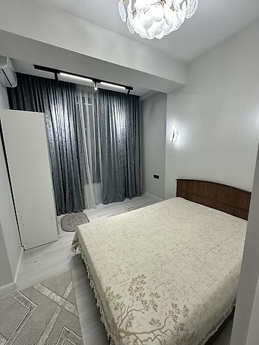 - Спальня: двуспальная кровать с высоким изголовьем, шкаф для хранения, кондиционер, плотные шторы и тюль, потолочная люстра и настенный бра.
