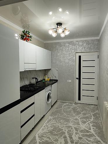 - Кухня: лаконичный гарнитур в глянце с большим количеством систем хранения, черная столешница, варочная поверхность на 4 конфорки, встроенная раковина, вытяжка, электрический чайник, стиральная машина. Фартук под мрамор, потолочный светильник, удобная планировка «линейка».