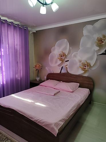 - Спальня: двуспальная кровать с высоким изголовьем, комплект постельного белья, прикроватная тумба, декоративные элементы и фотопанно с орхидеями. Затемняющие шторы на люверсах.