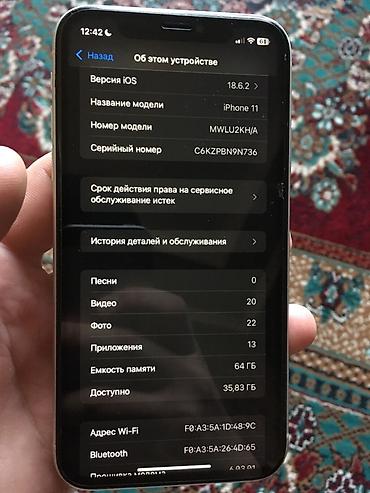 IPhone 11, 64 ГБ, белый Характеристики и детали с экрана: - Модель: iPhone 11 (Model No. MWLD2LL/A) - Память: 64 ГБ (доступно около 49,73 ГБ) - iOS: 18.6.2 - Серийный номер виден на фото экрана “О...