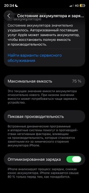 - Аккумулятор: максимальная ёмкость 75%;
