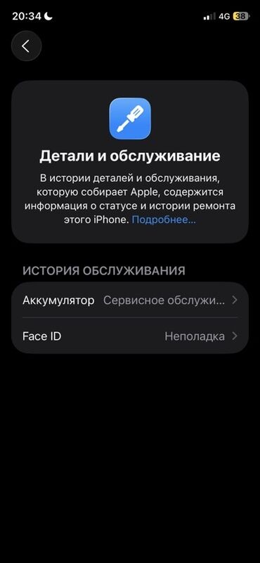 - Безопасность: Face ID (в разделе «Детали и обслуживание» отображается «Неполадка»)