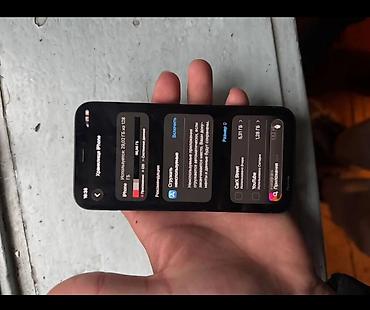 Компактный корпус, фирменный дизайн, высокое качество фото и видео. На экране видны текущие скриншоты рабочего стола и меню, подтверждающие объем памяти и работу Face ID. Цвет — черный.