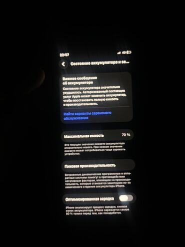 - Раздел «Состояние аккумулятора»: отображается важное сообщение, максимальная емкость 70%, включена функция «Оптимизированная зарядка».
