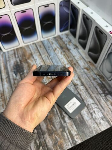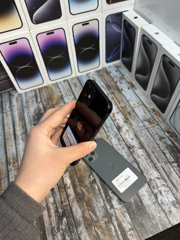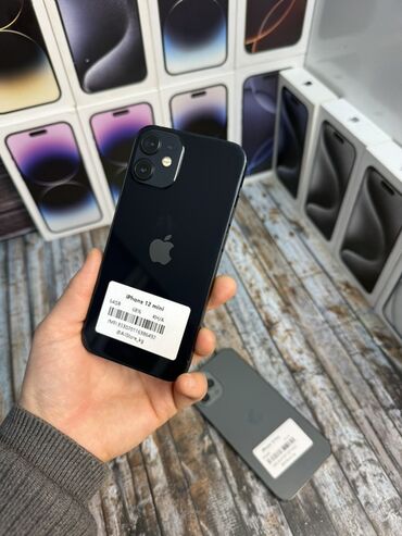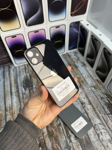 На фото устройство в черном цвете; видны фирменные коробки на заднем плане. На наклейке устройства указано: iPhone 12 mini, 64GB.