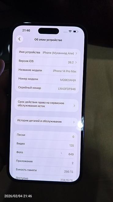 - На странице «Об этом устройстве» видны: модель iPhone 14 Pro Max, 256 ГБ, часть серийного номера, версия iOS 26.2.