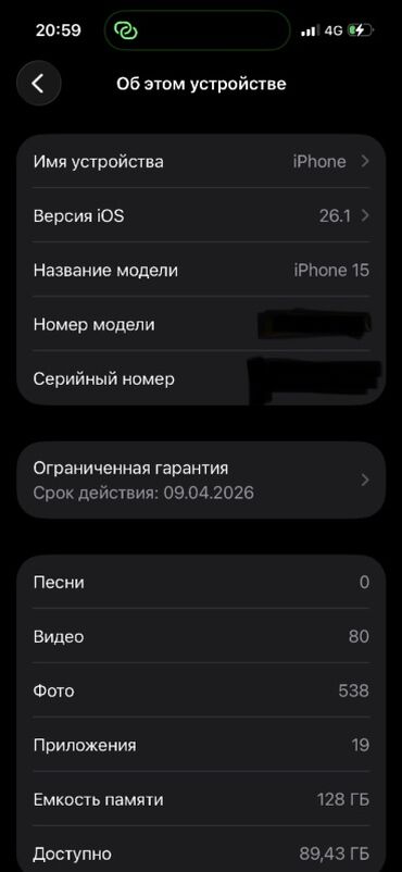 Продается iPhone 15. 1. Черный цвет 2. 128 ГБ 3. Две физические SIM-карты 4. Состояние батареи 90% 5. 481 цикл зарядки Недостатки: 1. Небольшие царапины сверху и по бокам 2. Очень небольшая трещи...