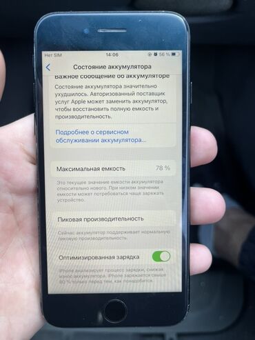 - Аккумулятор: максимальная емкость 78%, оптимизированная зарядка включена; в разделе «Состояние аккумулятора» отображается сообщение о необходимости сервисного обслуживания