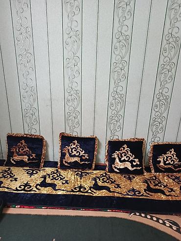 - Четыре квадратные подушки в едином стиле: темно‑синие лицевые стороны с золотистым узором «олень», объемная окантовка по периметру.