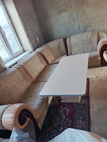 - Угловой мягкий диван бежевых тонов с подлокотниками, рассчитан на несколько посадочных мест.