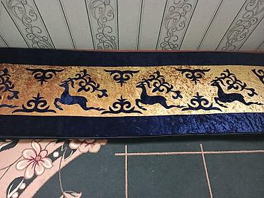 - Длинный декоративный напольный мат/дорожка из бархатистого материала с контрастной окантовкой. Основной цвет — золотистый с темно‑синим, орнамент с силуэтами бегущих оленей и традиционными узорами.