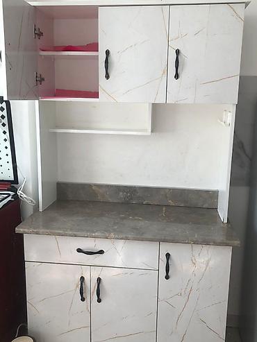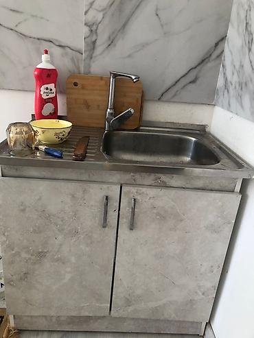 - Комплект содержит: навесные шкафы, напольные тумбы, рабочую столешницу, мойку из нержавеющей стали со смесителем.