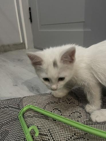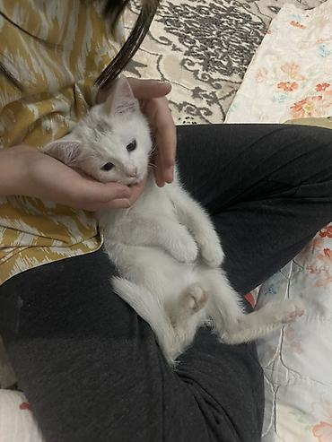 Белый котёнок, турецкая ангора-девочка с серым пятнышком на макушке. Домашний, ручной, ласковый — любит сидеть на коленях и спокойно относится к поглаживаниям и аккуратным играм с детьми. Чистоплотный, приучена к лотку. Питается влажным/сухим кормом для котят. Возраст — примерно 2–3 месяца (по размеру и повадкам). Подойдёт для квартиры: активный в игре, в остальное время спокойно отдыхает. Шерсть короткая, мягкая, легко ухаживать — достаточно регулярного вычёсывания. Прекрасный компаньон для семьи или одинокого человека, ищущего ласкового друга.