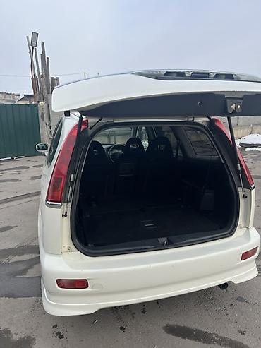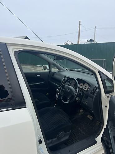 Белый минивэн Honda Stream, отличающийся обтекаемым дизайном кузова и просторным салоном. Автомобиль оснащен литыми дисками и аэродинамическими обвесами по периметру, что придает ему спортивный вид. Открытая задняя дверь демонстрирует вместительный багажник, подходящий для перевозки грузов или багажа. Модель Stream известна своей практичностью и комфортом, что делает ее подходящим выбором для семьи или для длительных поездок.
