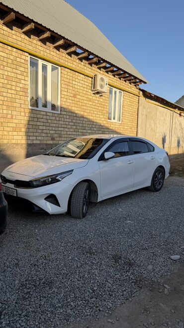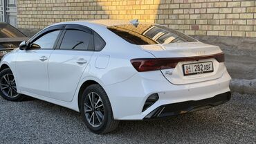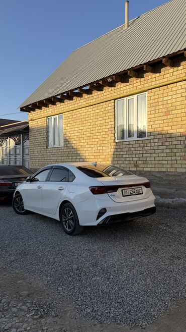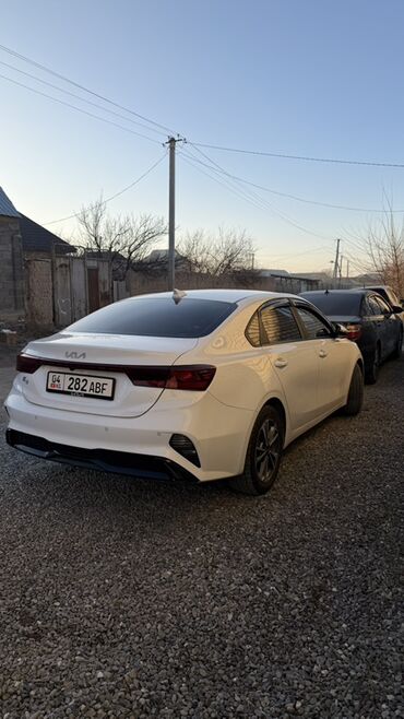 Kia K3 (седан), белый цвет, актуальная эмблема Kia. Современный дизайн с динамичным передним бампером, светодиодной оптикой и соединённой задней световой линией. Лёгкосплавные диски, тонированные стёкла, антенна «акула». Задние парктроники, камера/место под камеру (подготовка), светодиодные ДХО, повторители поворотов в зеркалах. Аэродинамичный задний диффузорный обвес. Практичный 4‑дверный кузов с просторным салоном и большим багажником. Экономичный городской седан с современным внешним видом и удобной посадкой. Номерные знаки KG на авто.
