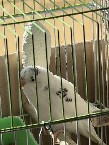 Волнистый попугай (окрас: белый с серыми/черными отметинами на голове и крыльях). Самец 8 месяцев,готов к размножению