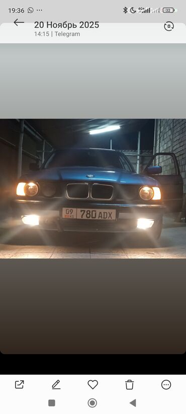 BMW 5 серии (E34), седан, сине-бирюзовый цвет кузова. Классический дизайн с фирменной «двойной» оптикой и решеткой BMW.