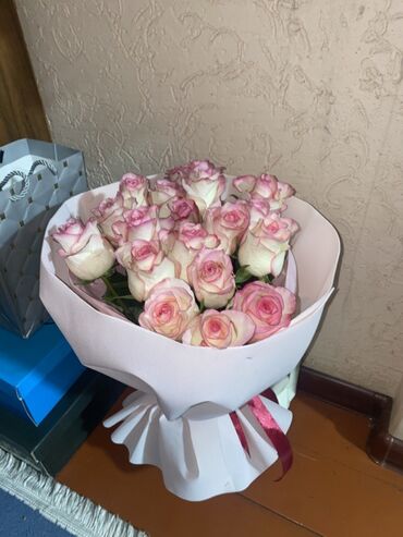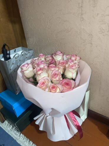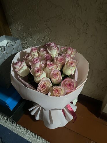 - Состав: около 17–19 роз с кремово‑белыми лепестками и розовой окантовкой.