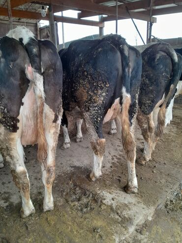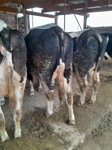 Продаются бычки (черно-пестрый тип). На фото — молодняк в стойле, крепкая конституция, ровные ноги, хорошо развитый зад. Подходят для откорма на мясо.