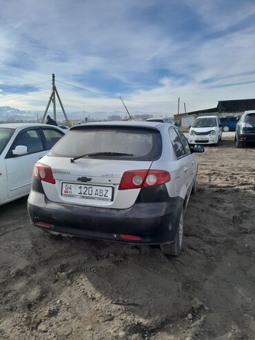 Chevrolet Lacetti седан, серебристый цвет, на киргизских номерах (KG 06). Кузов 4‑дверный, тонированные стекла по кругу. Литые диски, противотуманные фары, хромированная вставка на решетке радиатор...