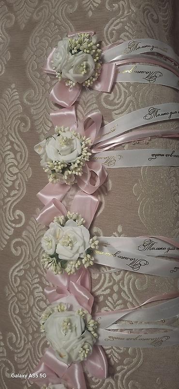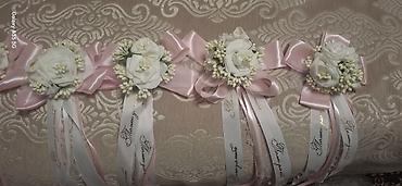 - Дизайн: композиции с белыми розами и бутонами, украшенные пышными бантами из атласной ленты нежно‑розового цвета.